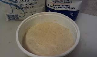 In a small container, add a teaspoon of sugar and warm water. Make sure the water isn't "gah, that's cold" or "shit! that's hot," but rather "mmm, that's nice." Cold water won't activate the yeast and hot water will kill it. Add one tablespoon of yeast.